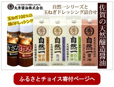 天然醸造の醤油「自然一醤油」シリーズ4本と、佐賀県産玉葱をたっぷりと使ったドレッシング2種の6本セットです。