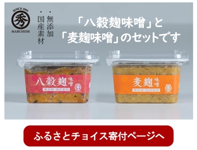 コク深い麦麹味噌と、大麦・白米・黒米・赤米・緑米・あわ・はと麦・ひえの8種の穀物で作った八穀麹味噌の2種をお楽しみください。