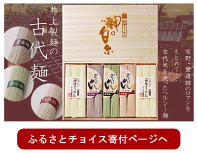 吉野ヶ里遺跡にちなんだ、赤米などの古代米を使った『古代麺』と素麺のセットです。古代麺赤米麺・紫米麺・熊笹麺が1袋ずつ、神埼そうめん「神の白糸」が2袋入っています。